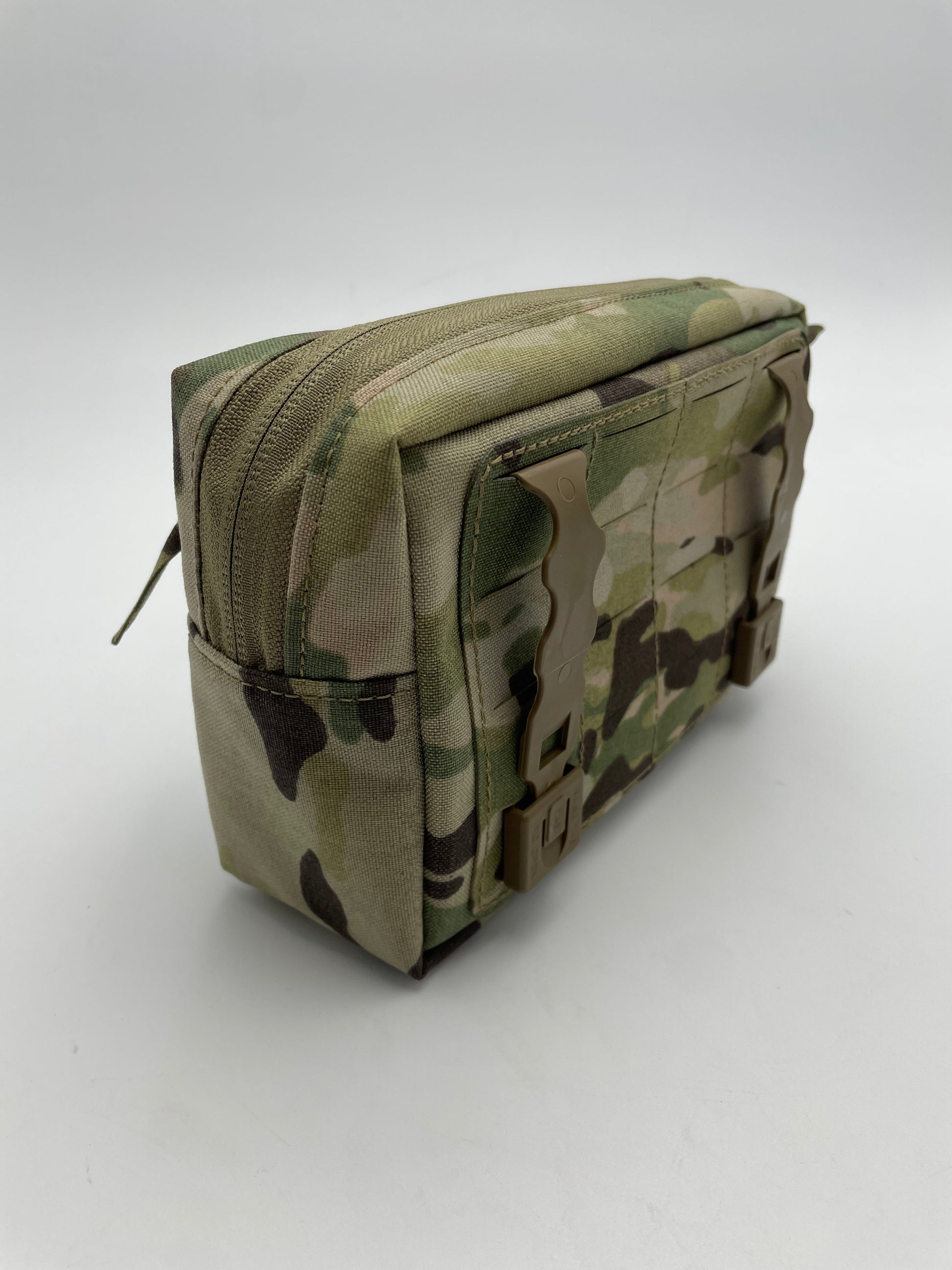 It features a four row laser cut Molle panel, laser cut zipper pulls, and a 2x6" loop field on the face of the pouch for use indicator placards.
